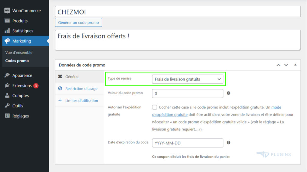 WooCommerce ne permet pas nativement de rendre les méthodes de livraison déjà configurées gratuites via un code promo classique. La livraison gratuite est considérée comme une méthode distincte, et non comme une remise appliquée aux transporteurs existants.